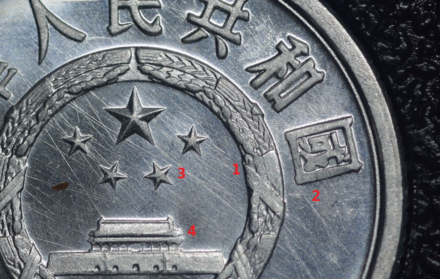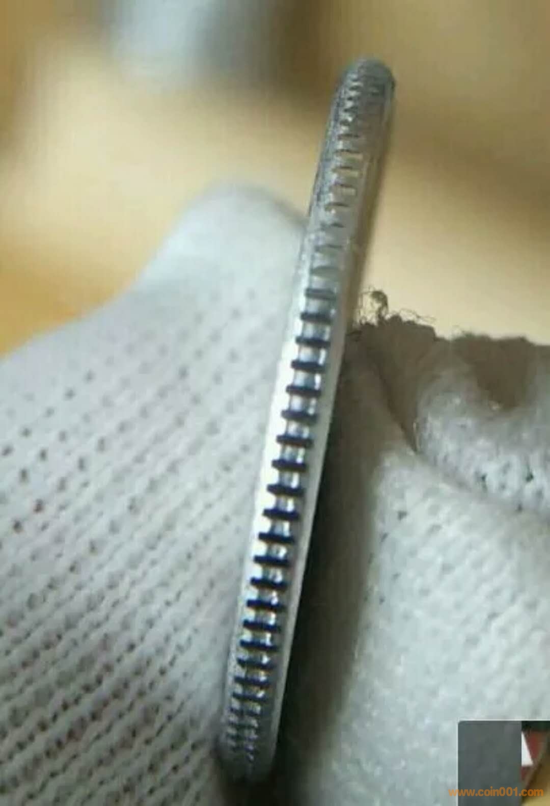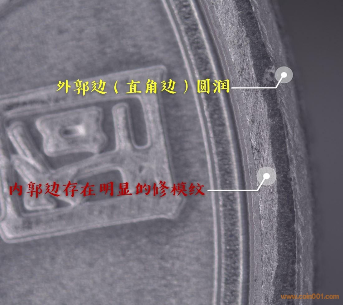 相反,如李兄所說的是模具印壓出來是合理的,模具設(shè)計(jì)時(shí),為脫模方便都會(huì)設(shè)計(jì)成斜坡,精度要求高的,坡度小些,精度要求低的,坡度相對(duì)大些,還有就是模具每使用一些時(shí)間后,表面也會(huì)變粗糙,特別是模具中的凹處會(huì)附上污垢,都要根據(jù)需要定期拋光清理,從這枚幣的邊圈內(nèi)側(cè)斜坡面拆扇般平面的形態(tài)和長(zhǎng)短不一的直線拋光紋,可看出這斜坡應(yīng)是模具壓出來的。