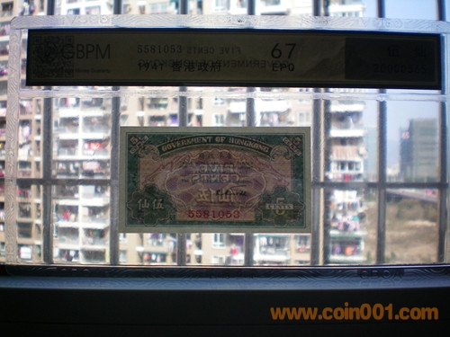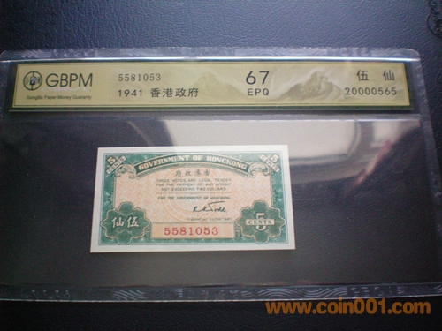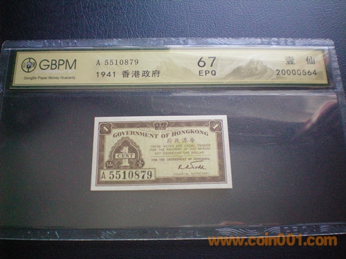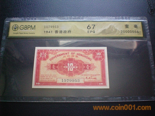 GBPM評級 67E --- 早期香港政府1毫.5仙.1仙紙*幣3張一套 1941年發(fā)行 1800元