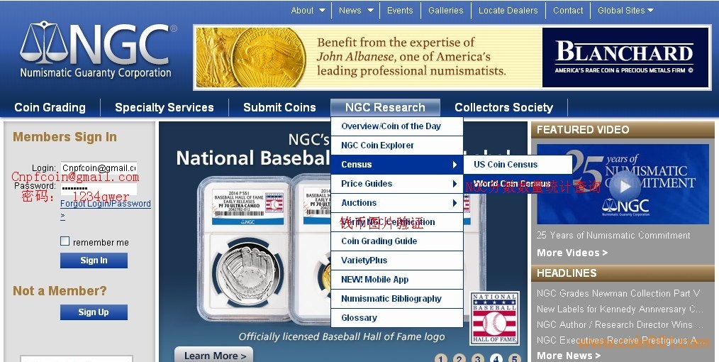 提供已知鑒定編號的錢幣查詢驗證功能。需要使用者是NGC會員(免費會員即可),這里注冊了一個公共帳號供大家使用(帳號: