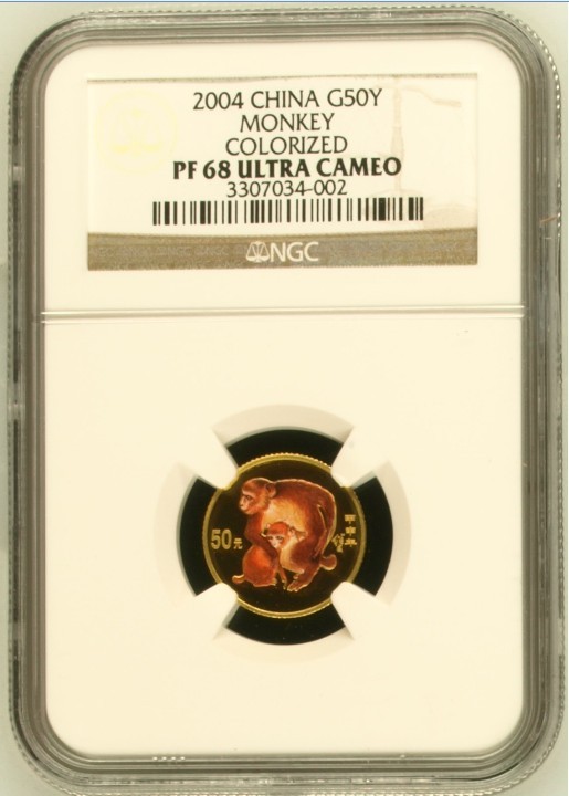 NGC評(píng)級(jí)PF68UC 2004年1/10盎司猴年彩色紀(jì)念金幣(悖逆版),售6000元。順豐包郵,如需走中介費(fèi)用買家付。不常在線,請(qǐng)手機(jī)短信聯(lián)系,以我確認(rèn)為準(zhǔn)。