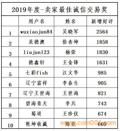 鼠年伊始,為持續(xù)弘揚(yáng)誠(chéng)信精神,營(yíng)造風(fēng)清氣正的網(wǎng)站交易氛圍,經(jīng)版主會(huì)議討論,決定對(duì)2019年度最佳誠(chéng)信交易會(huì)員進(jìn)行獎(jiǎng)勵(lì)。獲獎(jiǎng)人員為買家和賣家2019年度好評(píng)最多的前十名會(huì)員,且沒有差評(píng)。