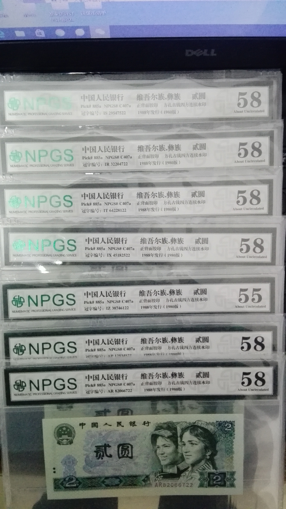 802綠鉆是1988年發(fā)行的二元券在1994~1995年印制階段曾經統(tǒng)一試驗過一小部分熒光防偽券。它的紙張?zhí)卣髋c現(xiàn)在已經在100多元的綠幽靈的紙張是完全相同的!它存在于自IQ、IR、IS、IT、IU、IW、IX、IY、IZ、AP、AQ、AR、AS、補號JZ合計14個冠字中。 經過一段時間的收集,終于收全802綠鉆7張冠號,并且雙尾同22,但經NPGS評級,全部58.現(xiàn)低價惠讓給綠友,7張評級幣700元,評級錢幣一律以分數(shù)為準,非假不退。