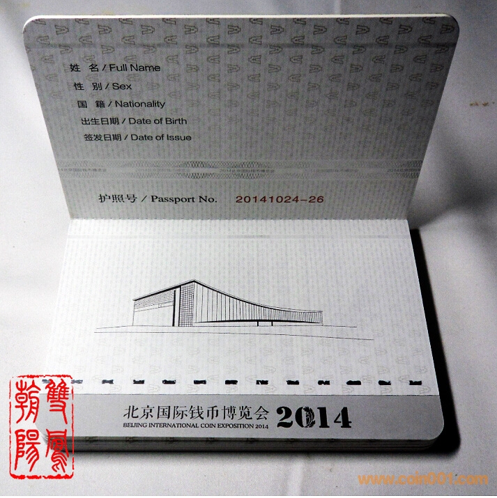 該護照封面鑲嵌圓形純銀紀念章,采用浮雕做舊的鑄幣工藝,由成色99.9%的5克純銀鑄造而成。紀念章圖案以國家會議中心鳥瞰圖為背景,巧妙地將2014北京國際錢幣博覽會銀質(zhì)紀念幣和部分國外硬幣交錯疊放在其上方,寓意北京國際錢幣博覽會是弘揚世界錢幣文化的理想舞臺。