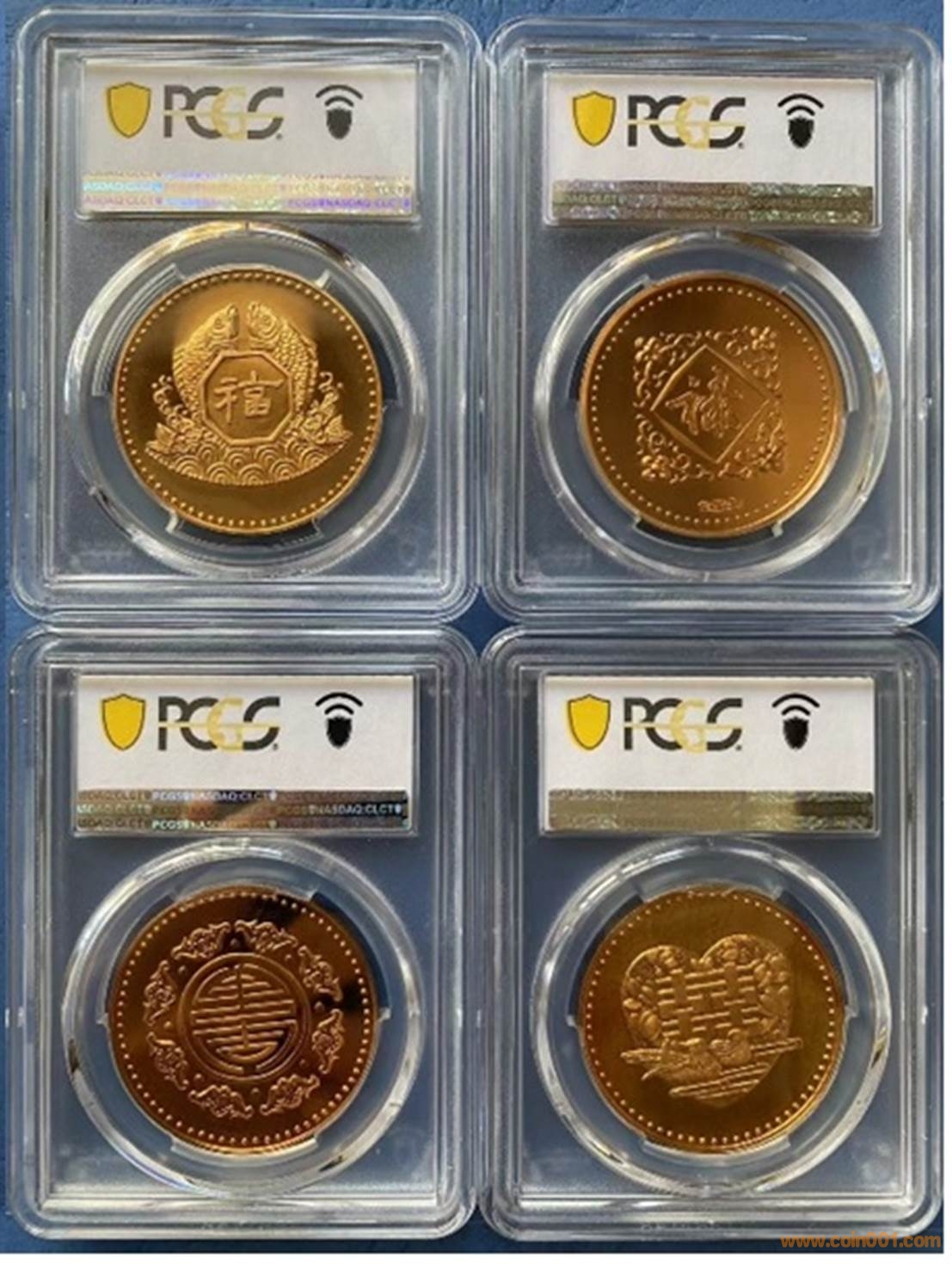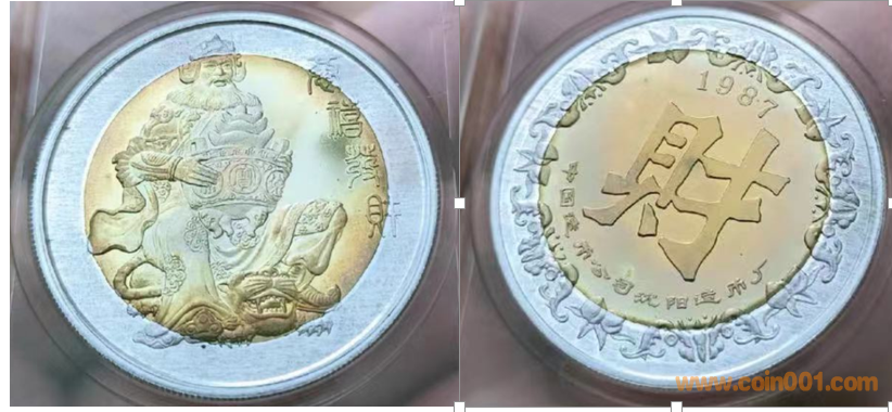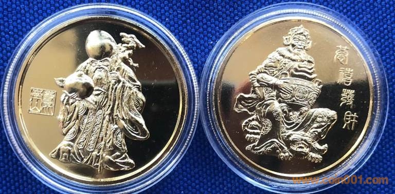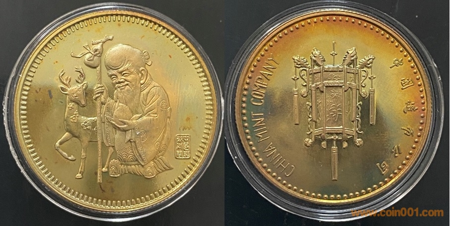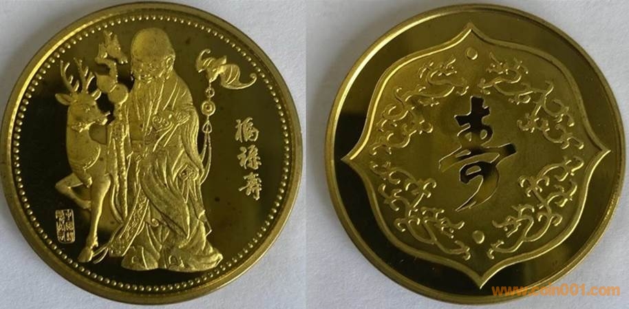 1987年40mm白銅黃銅鑲嵌精制、黃銅普制鍍金沈幣發(fā)行。正面為武財神(老壽星),反面為財(壽)字。