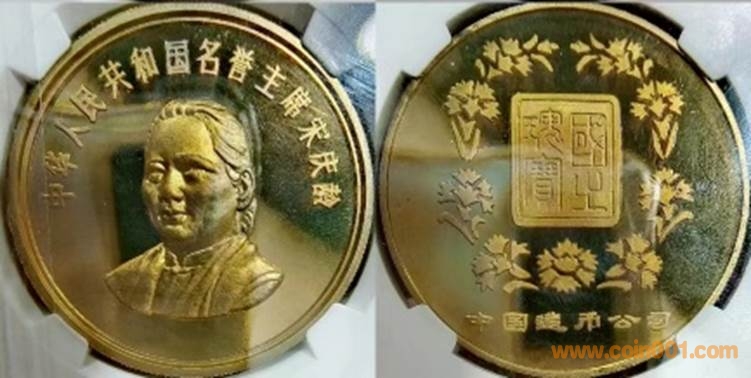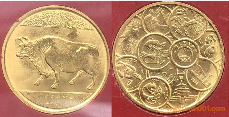 1985年制造白銅普制鍍金30mm上幣制造。設計雕刻:余敏。正面為牛,反面為壽字。