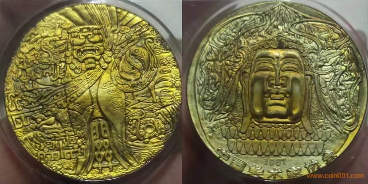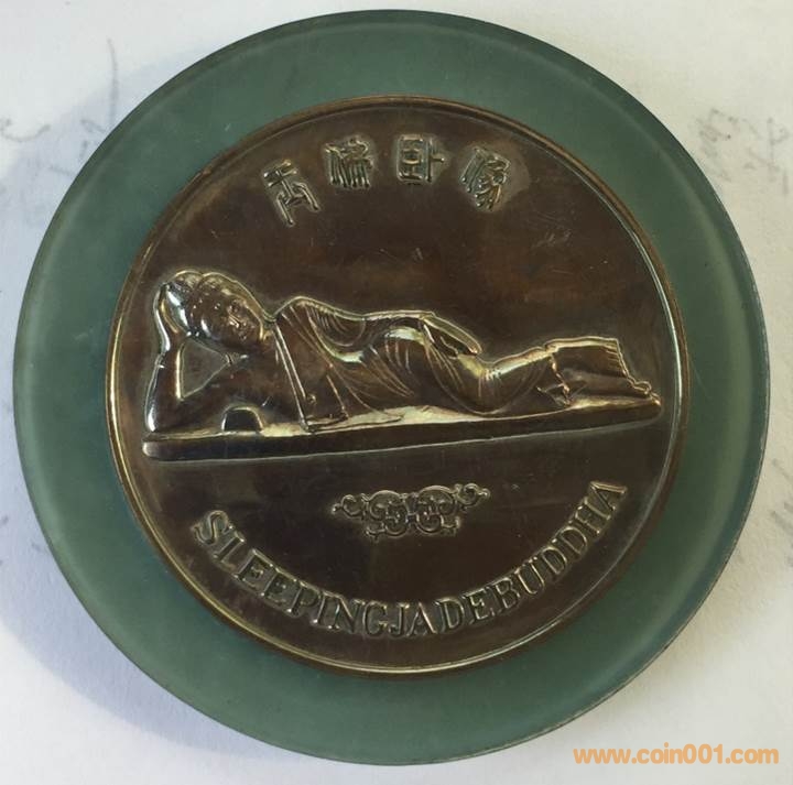 1987年制造,40mm黃銅精制沈幣發(fā)行(待考)。正面為四大神獸,反面為大佛。