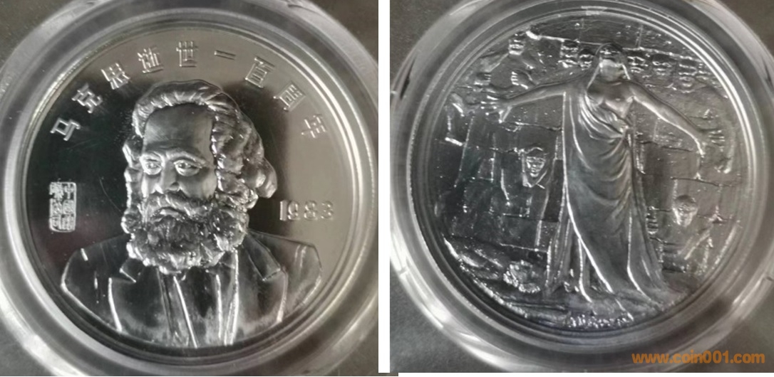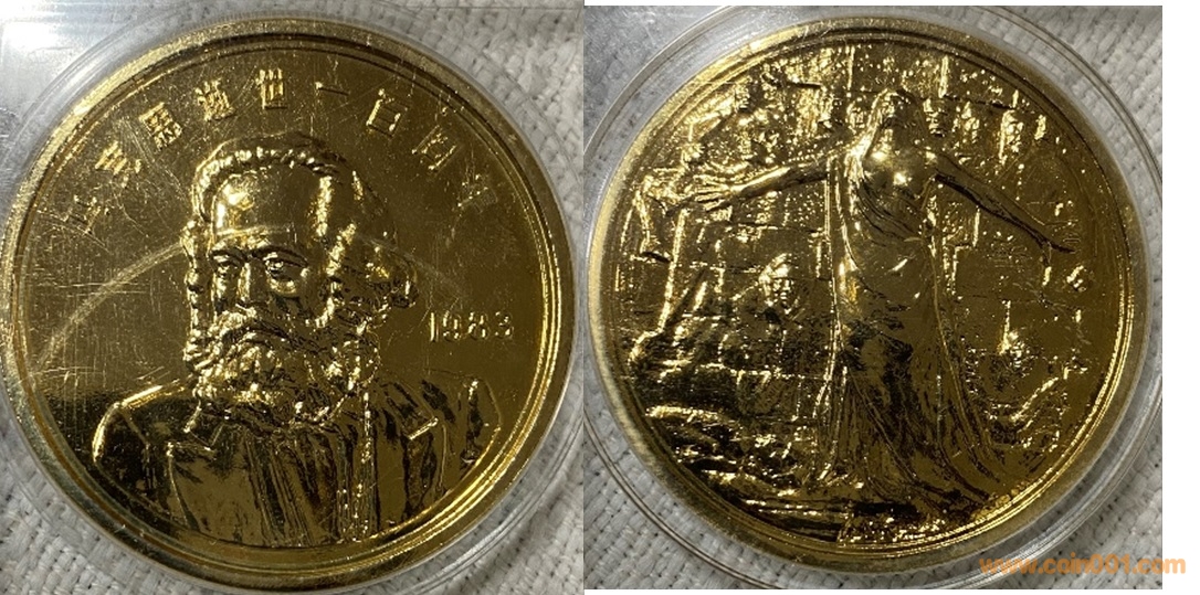 1983年40mm鋁精制、鍍金普制沈幣發(fā)行。正面為馬克思,反面為巴黎公社社員墻。