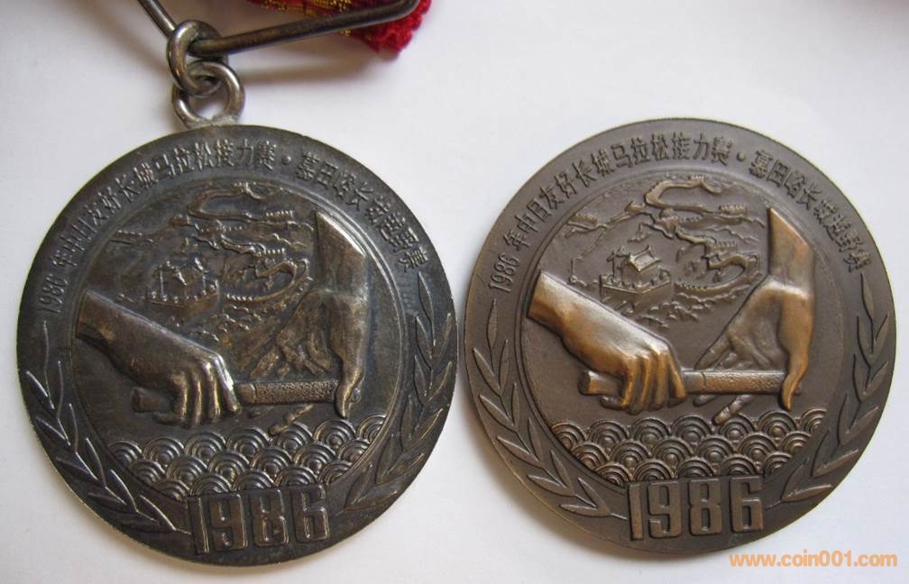 1986年制造紫銅本色紫銅上色45mm上幣發(fā)行。正面為雙手接力,反面為光面。