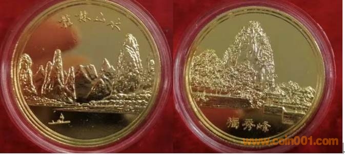 1983年制造黃銅普制鍍金27mm沈幣發(fā)行。正面為桂林山水字樣,反面為獨秀峰。