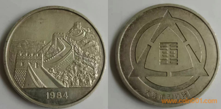 1984年42mm-37mm黃銅普制上幣制造。設計雕刻:羅永輝。正面為上海造幣廠廠房,反面為單面。