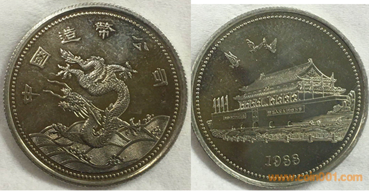 1989年制造,黃銅普制鍍金36mm上幣發(fā)行。正面為馬踏飛燕,反面為印鈔設備。東河印制公司也有鍍金版,見過實物,暫時沒有照片。