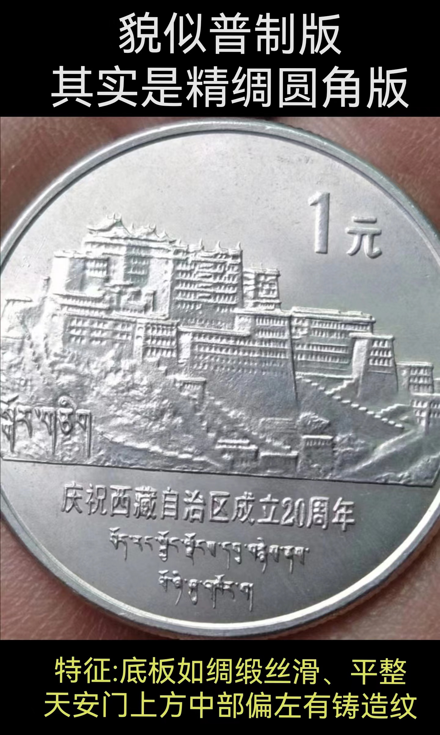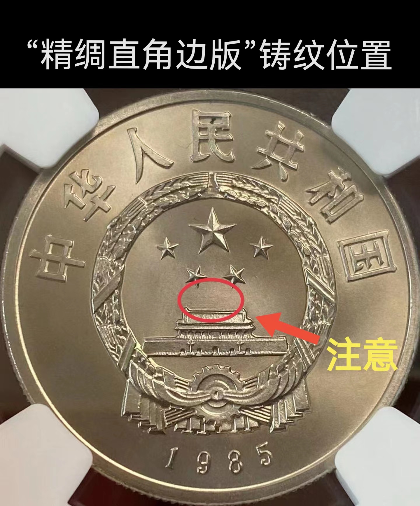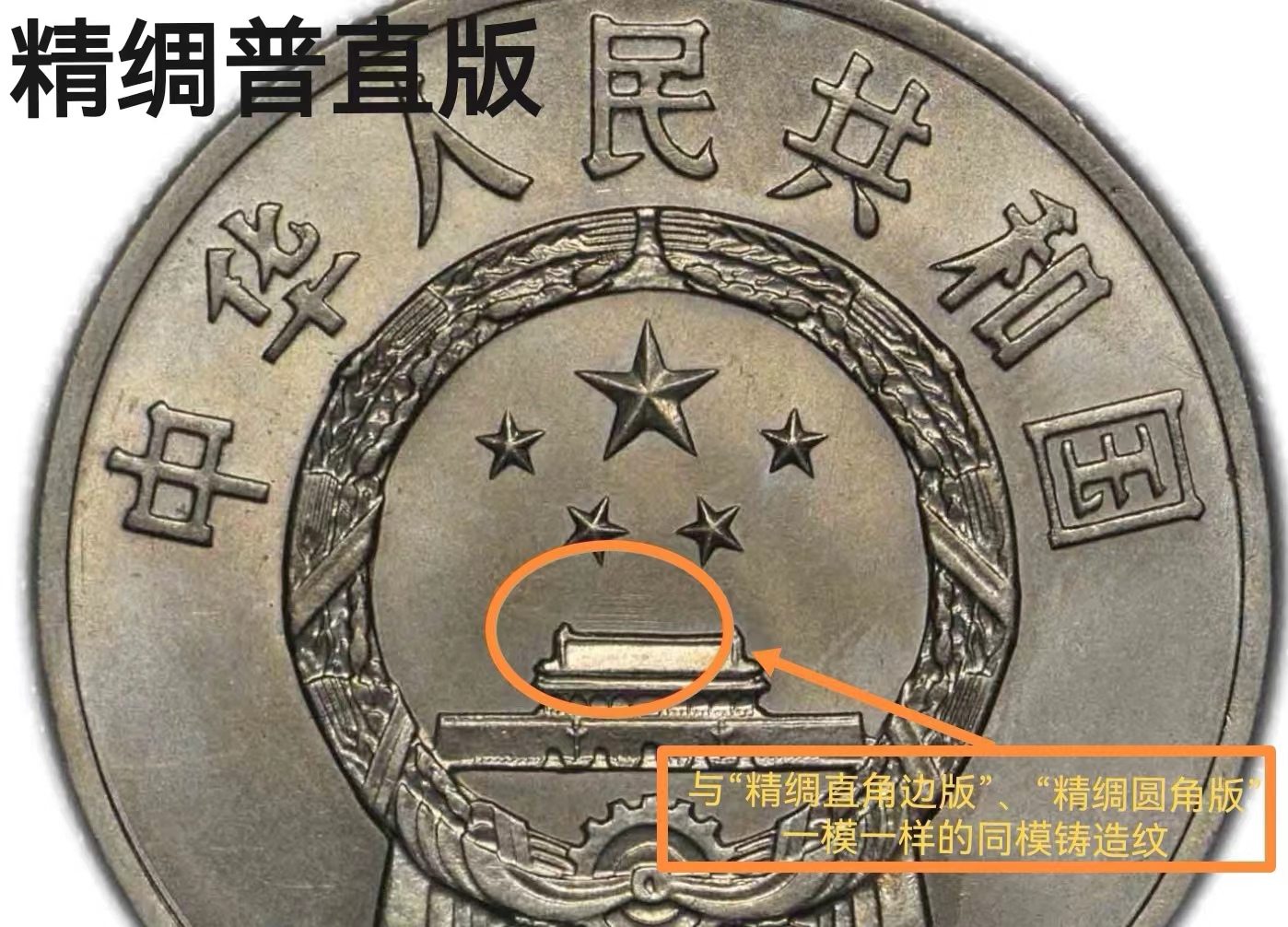雖然大家都明白這3種版別的狀態(tài)品質(zhì)不一樣,但這3種版別都有一個共同的特征,那就是國徽天安門上方中部偏左的位置,有一塊輪廓大致像天安門城樓的鑄紋。