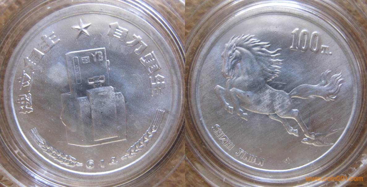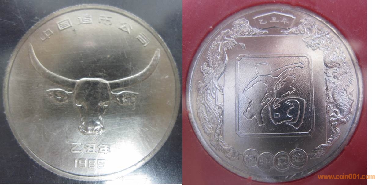 1985年制造,白銅普制30mm,上幣發(fā)行。正面為牛頭,反面為福字。