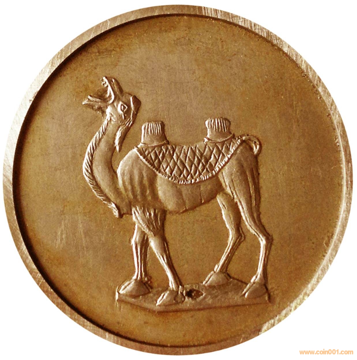 1981年制造,紫銅普制30mm,上幣發(fā)行,發(fā)行量10枚內(nèi)。正面為唐三彩駱駝,反面為光面。此枚章為造幣廠工作章。參考價:8000-15000。