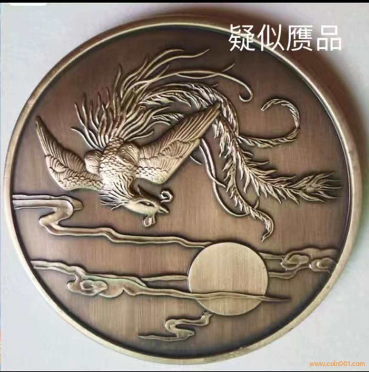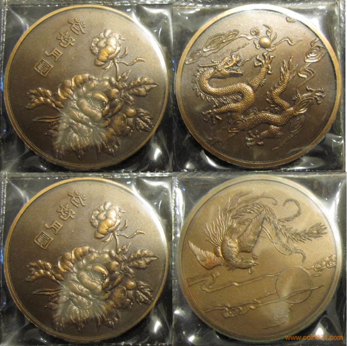 1981年制造,45mm,上幣發(fā)行。正面為牡丹花,反面為龍鳳。近期筆者發(fā)現(xiàn)了此鳳章的假章,假章相比真章雕刻僵硬死板,太陽部分相比真章更加橢圓形,上色不均勻,某些部分發(fā)綠,有鑄痕。