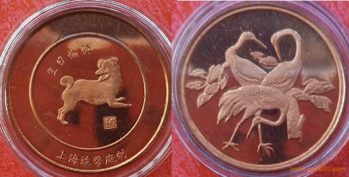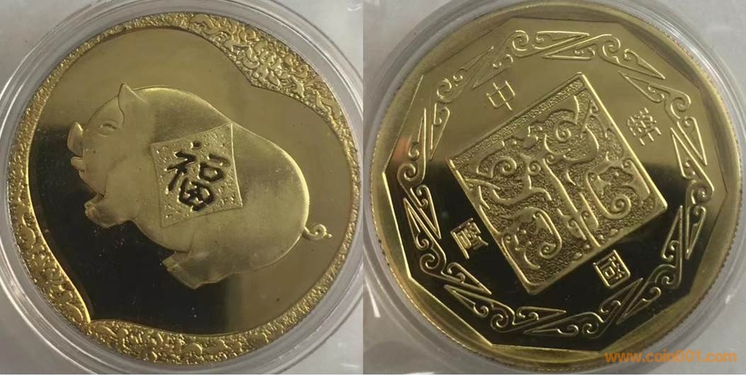 1983年制造,黃銅精制33mm上幣發(fā)行。正面為豬,反面為中國硬幣。