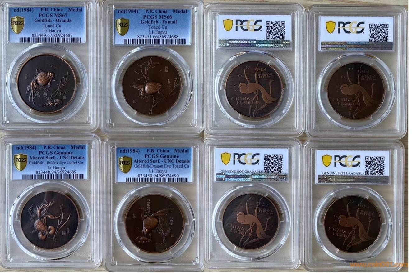 1984年制造,36mm,上幣發(fā)行。正面為金魚抽象圖案,反面為龍睛,高頭,水泡眼,珍珠。