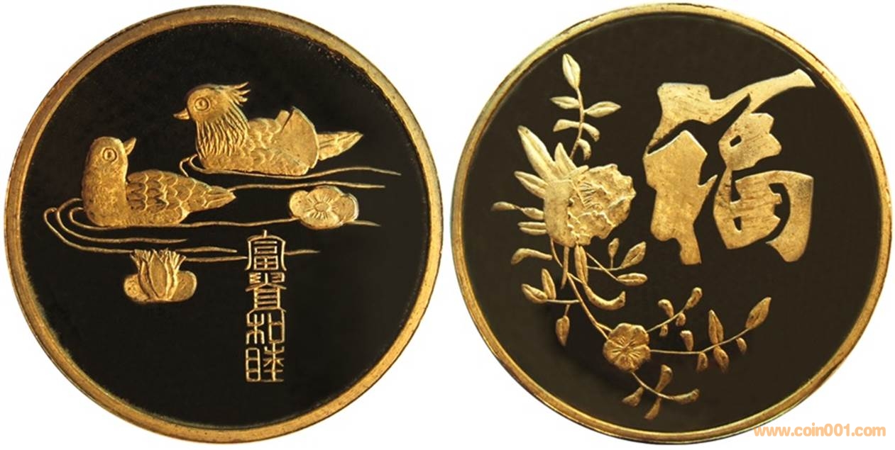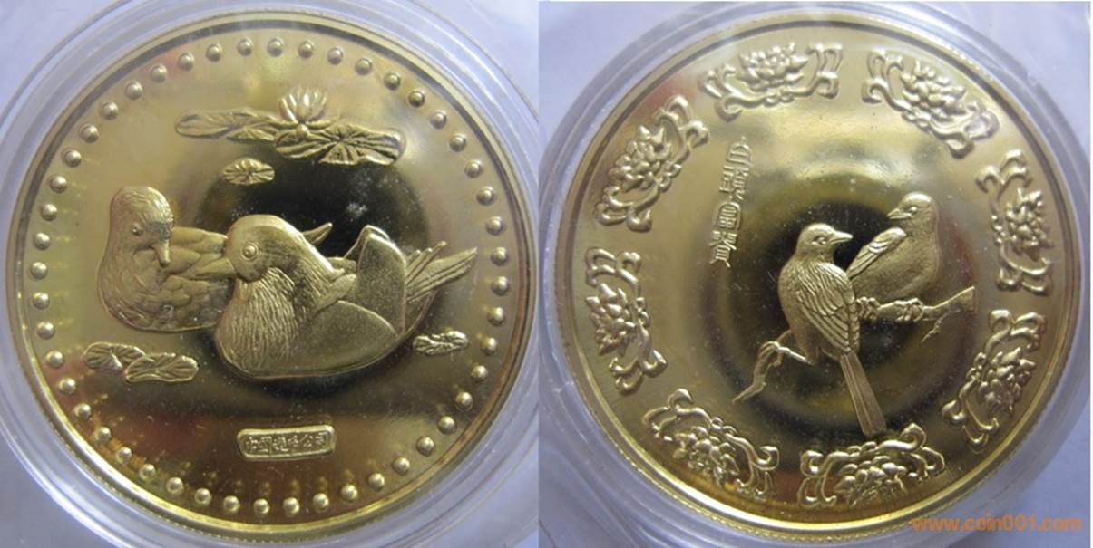 1983年制造,33mm黃銅精制,上幣發(fā)行。正面為鴛鴦戲水,反面為白頭鳥。