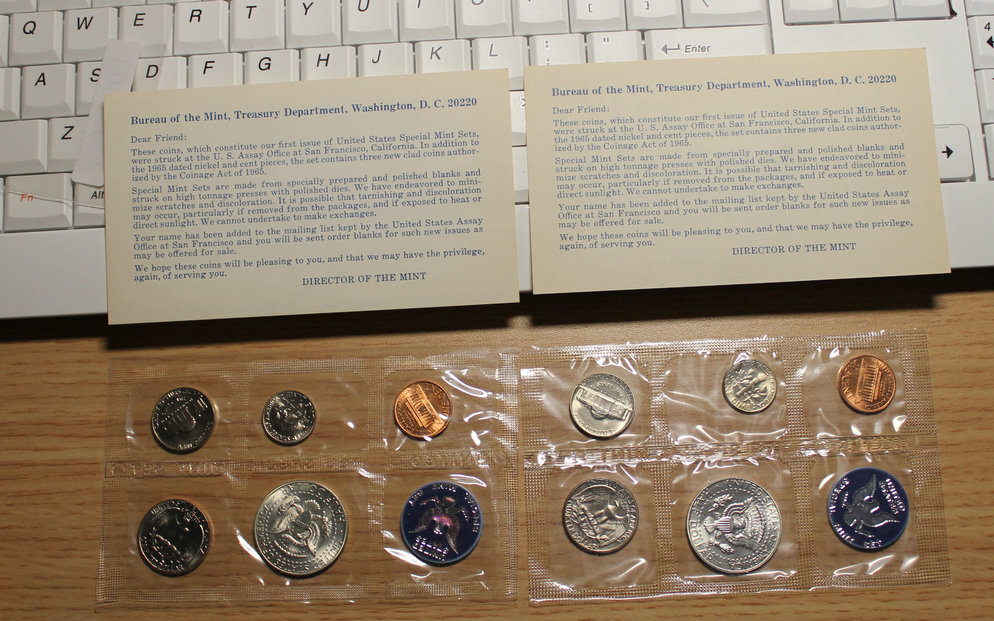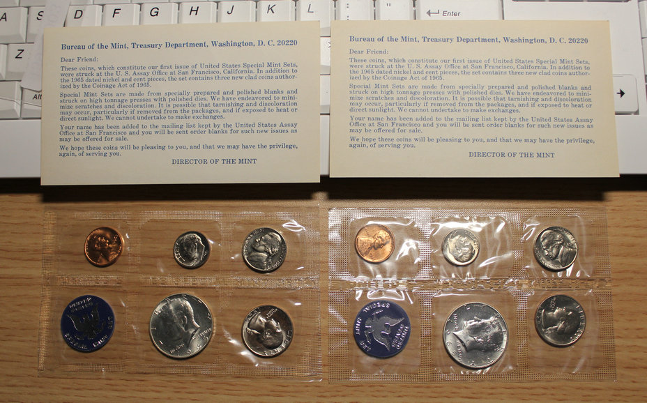 1965-1967年 是比較特殊的三年,沒(méi)有出品過(guò)Proof套,而是在三藩市鑄幣廠出品了Special Mint Set特殊工藝幣套,簡(jiǎn)稱(chēng)SMS,SMS套不打S印,生產(chǎn)工藝也是特別工藝,SMS也理解成為精致套幣,krause錢(qián)幣錄都是歸在Proof Set分類(lèi)底下的