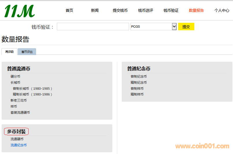 查詢方式: 同時11M再評級將新辟多幣封裝的數(shù)量報告,每個加標的PCGS多幣封裝都會統(tǒng)計到數(shù)量報告內(nèi)。進入11M官網(wǎng),點擊數(shù)量報告,點擊多幣封裝,根據(jù)分類查詢多幣封裝數(shù)量報告截圖展示: