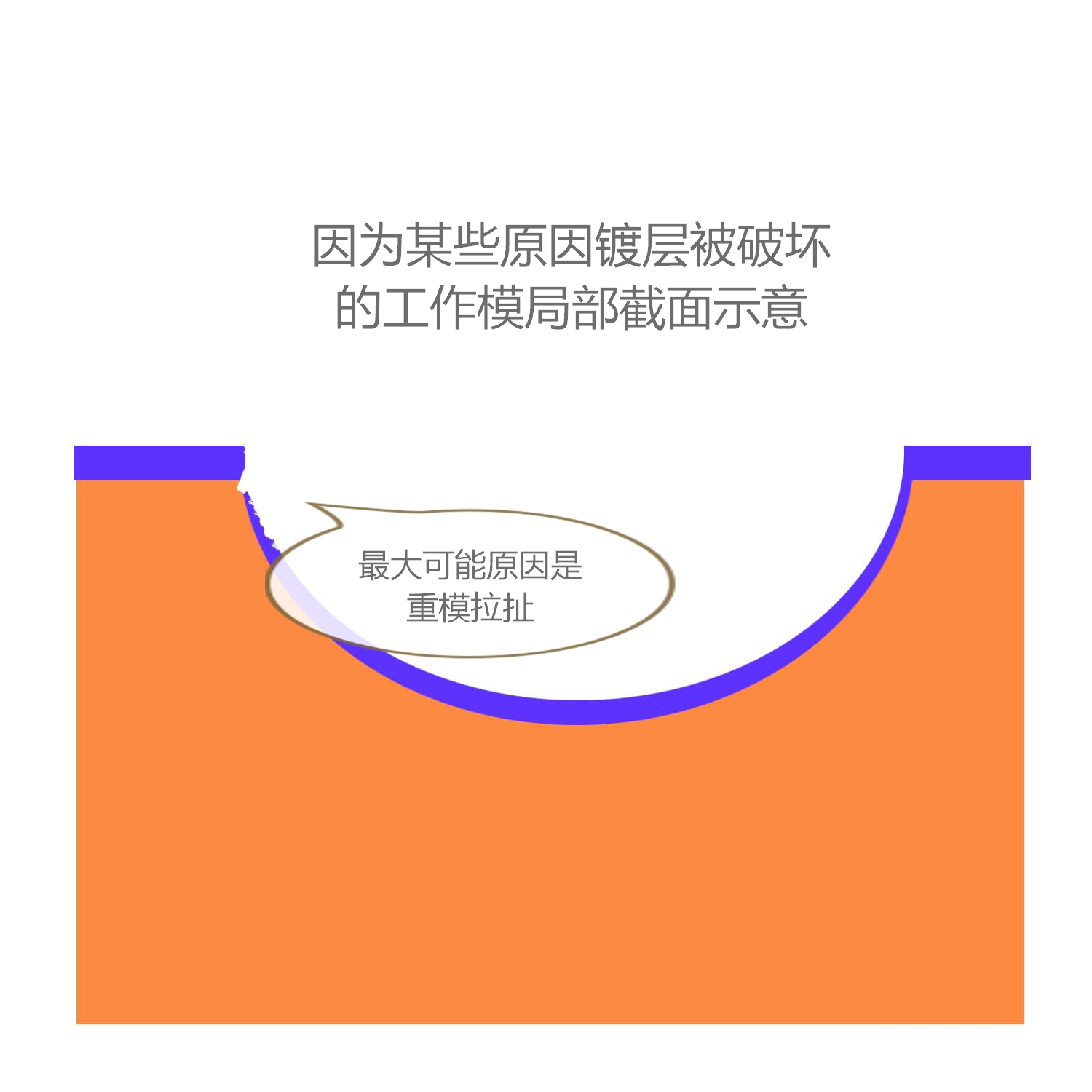 客觀來(lái)講,先天破皮可以細(xì)分為兩類,一類是模具制造完成就有成規(guī)模的破皮,從打制的第一枚幣開(kāi)始就有多肉(當(dāng)然前期極細(xì)微),還有一種可能是模具制造完成時(shí)鍍層是完整包覆模具工作面的,但有些部位明顯的大面積薄弱,強(qiáng)度明顯低于工作面其他部位,在工作模正常使用打制硬幣的過(guò)程中,只打制了少量的幣這些薄弱部位就幾乎同步產(chǎn)生了破皮,本質(zhì)上來(lái)講,這兩種情況原因皆是模具制造環(huán)節(jié)的異常,呈現(xiàn)方式也是從微觀的尺度開(kāi)始破皮并逐漸發(fā)展,區(qū)別只是在破皮之前有沒(méi)有打制一些正常幣,沒(méi)有本質(zhì)的差異,下文討論不再細(xì)分。