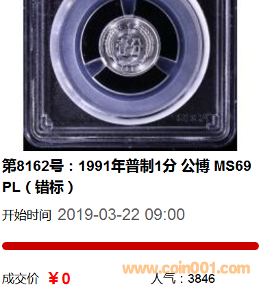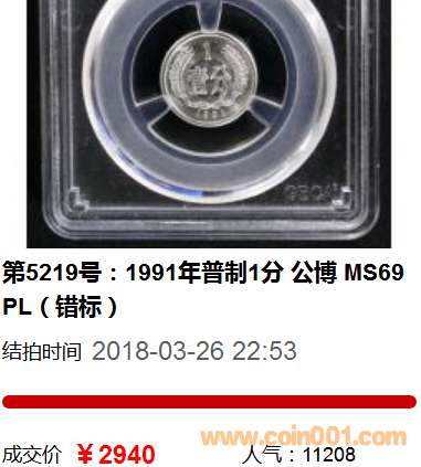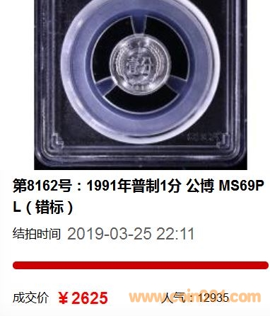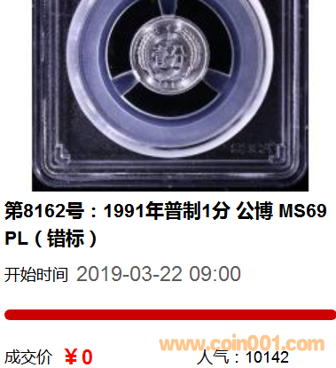 敬請關注2019年春秋大拍拍品第8162號:1991年普制1分 公博 MS69PL(錯標)