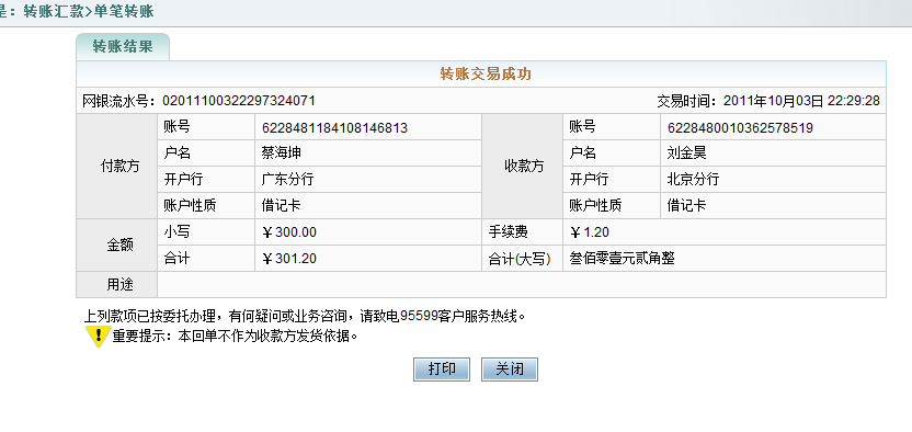 轉(zhuǎn)賬結(jié)果轉(zhuǎn)賬交易成功 交易時間:2011年10月03日 21:47:06 網(wǎng)銀流水號:02011100321467470869