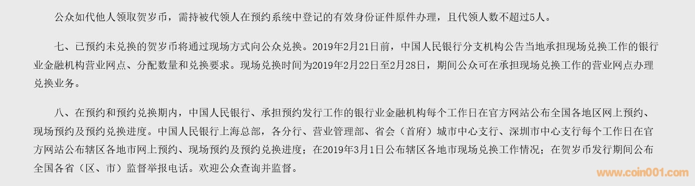 六、賀歲幣于2019年1月25日至2019年1月31日辦理預約兌換。公眾可按照約定的時間,持在預約系統(tǒng)中登記的有效身份證件,前往約定的營業(yè)網(wǎng)點辦理預約兌換業(yè)務。