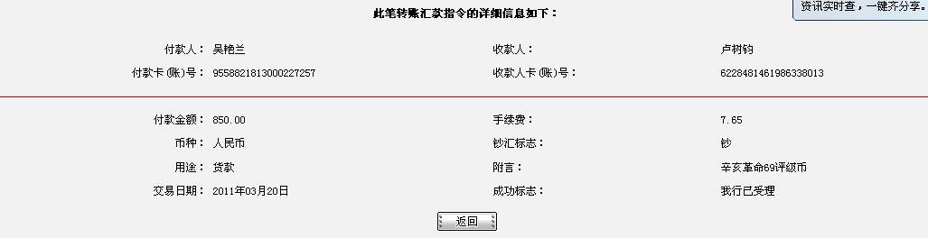 引用 引用第16樓楚天明珠1于2011-03-20 20:19發(fā)表的 : 款已轉(zhuǎn),用我老婆的卡轉(zhuǎn)的。請(qǐng)查收后發(fā)貨。謝謝盧兄,謝謝孫總。