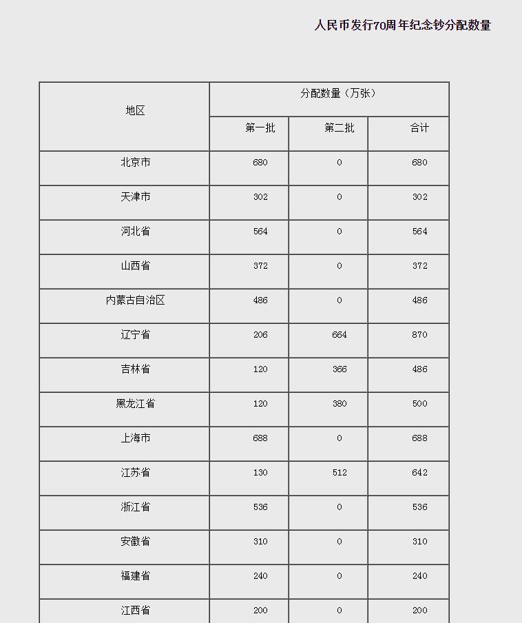 人民幣發(fā)行70周年紀念鈔分配數(shù)量