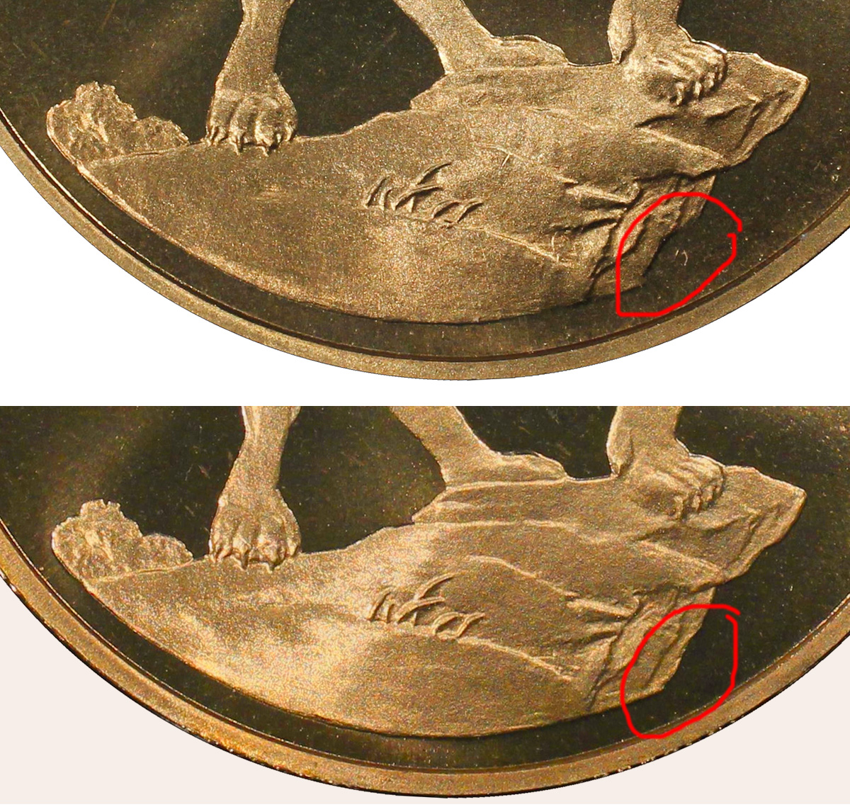 2、如果局部圖片,或老虎,或大石整體擴(kuò)大或縮小,當(dāng)屬于更大一級(jí)別的版別;而目前從兩張圖片對(duì)比看只是同圖案整體(包括大?。┎蛔?,少石,所以較傾向于修模的判斷