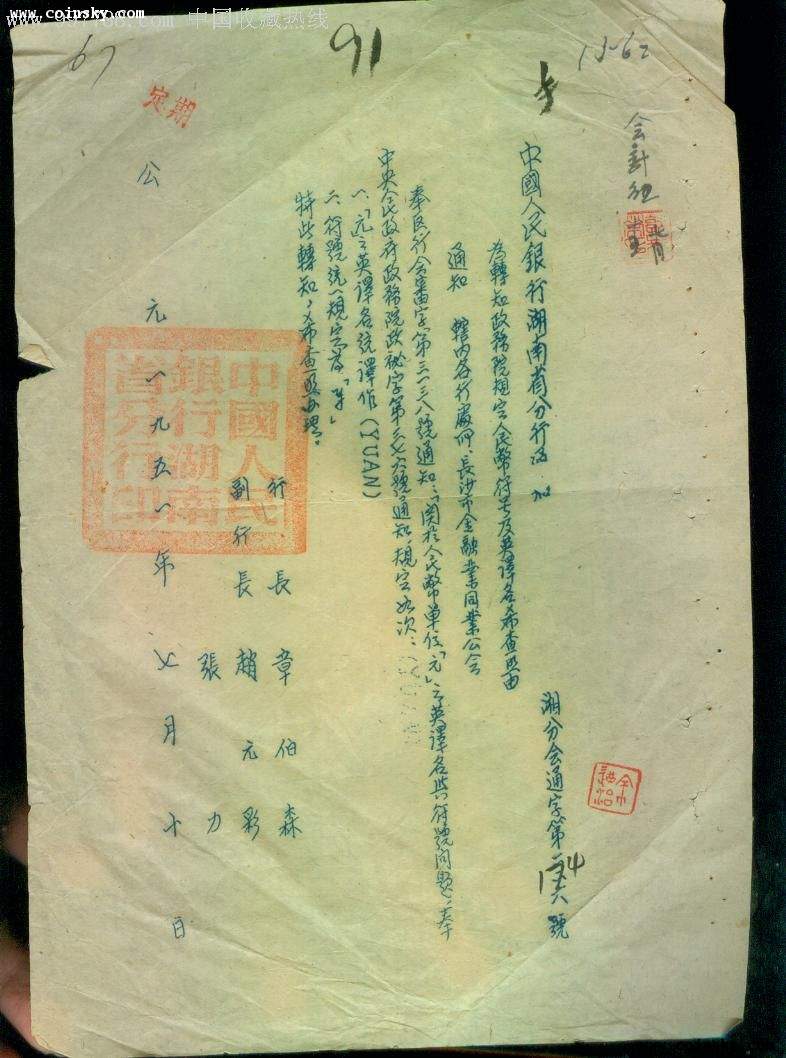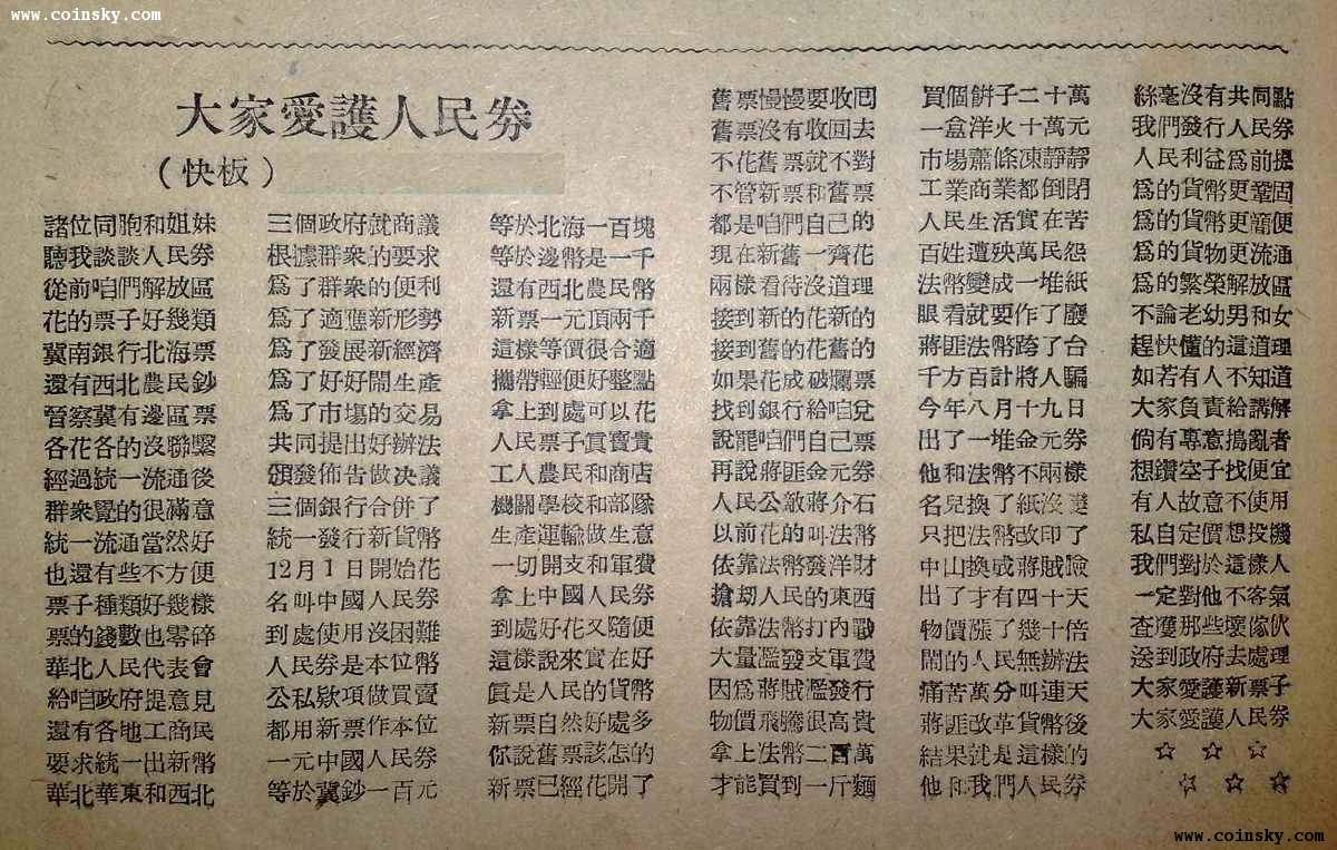 3、人民幣。中國(guó)人民銀行在籌建及成立之初、并未出現(xiàn)“人民幣”這種叫法。目前所能見(jiàn)到的最早記載“人民幣”的是《新華日?qǐng)?bào)(太行版)》民國(guó)三十八年二月十三日刊載新華日?qǐng)?bào)編輯部采通部的通知:“本報(bào)增加稿費(fèi)啟示:……每千字改增人民幣三十元(冀鈔三千元)?!?949年5月1日、蘇南郵政管理局發(fā)行加蓋“華中解放區(qū)改作人民幣”改值郵票一套六枚。以上報(bào)紙、郵票雖然出現(xiàn)“人民幣”的叫法、但影響不大。直到上海解放后、1949年5月28日中國(guó)人民解放軍上海市軍事管制委員會(huì)發(fā)布“金字第一號(hào)布告”——《關(guān)于使用人民幣及限期禁用偽金圓券的規(guī)定》:“(一)中國(guó)人民銀行所發(fā)行之人民幣,為解放區(qū)統(tǒng)一流通之合法貨幣。自即日起,所有完糧納稅以及一切公私款項(xiàng)收付,物價(jià)計(jì)算,賬務(wù),債務(wù),票據(jù),契約等均須以人民幣為計(jì)算及清算本位。不得再以偽“金圓券”或黃金銀元及外幣為計(jì)算及清算本位?!薄叭嗣駧拧卑殡S著上海金融中心的巨大影響力逐漸替代“人民券”成為全國(guó)的主流叫法。從上海解放初期的發(fā)票、收據(jù)實(shí)物看,6月份既有用“人民幣”、也有用“人民券”,6月10日前還有用美金、銀圓計(jì)價(jià)的。6月過(guò)后基本全用“人民幣”。