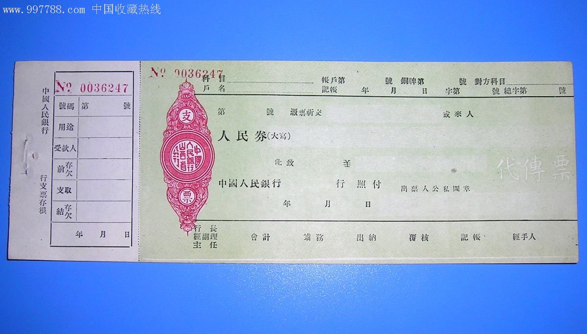 人行成立后、中央暫以華北人民銀行為中國(guó)人民銀行的總行,各地方銀行轉(zhuǎn)為中國(guó)人民銀行的分行,但各地方銀行仍歸各解放區(qū)自己領(lǐng)導(dǎo),進(jìn)行原來(lái)業(yè)務(wù)。所以在人行剛成立時(shí)、各解放區(qū)銀行并沒(méi)有在第一天就統(tǒng)一使用中國(guó)人民銀行字樣的銀行票據(jù)、而是沿用原來(lái)的老單據(jù)、有的甚至用到新中國(guó)成立。人行各區(qū)行、分行、支行正式成立后、銀行票據(jù)開(kāi)始多采用人民券、后用人民幣,貨幣符號(hào)$。1951年根據(jù)《中央人民政府政務(wù)院政秘字第三七六號(hào)通知》:“一、‘元’之英譯名統(tǒng)譯作(YUAN)。二、符號(hào)統(tǒng)一規(guī)定為‘¥’?!?、人行將貨幣符號(hào)改為¥、即人民幣和¥。但山西省分行和河北省分行仍沿用老叫法、即人民券和¥。