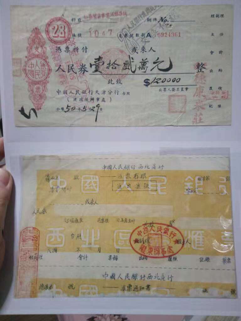 人民券這種叫法在當(dāng)時(shí)的銀行票據(jù)、發(fā)票、收據(jù)、郵票等得到了廣泛運(yùn)用。筆者收集到的就有:中國(guó)人民銀行西北區(qū)行匯票、中國(guó)人民銀行河北省分行匯票、中國(guó)人民銀行山西省分行支票、中國(guó)人民銀行天津分行支票、中國(guó)人民銀行南京分行匯款水單、中國(guó)人民銀行北京分行送款簙回執(zhí)、中國(guó)人民銀行秦皇島支行活期存款送金簙;天津東萊銀行支票、北京榮長(zhǎng)厚錢(qián)莊保本保值定期存款存單;武漢市人民政府稅務(wù)局房產(chǎn)稅繳款書(shū)、鄭州市房地產(chǎn)公司手續(xù)費(fèi)收據(jù)、江西省立贛州中學(xué)1949年第一學(xué)期雜費(fèi)收據(jù)、保定電信局電話費(fèi)通知單、中共中央直屬機(jī)關(guān)供給部收據(jù)、察哈爾省雁北專(zhuān)區(qū)供銷(xiāo)合作社發(fā)票、大同市專(zhuān)營(yíng)批發(fā)工商業(yè)統(tǒng)一發(fā)貨票、天津廣濟(jì)醫(yī)院收據(jù)、北京市總工會(huì)會(huì)費(fèi)收據(jù)等等。