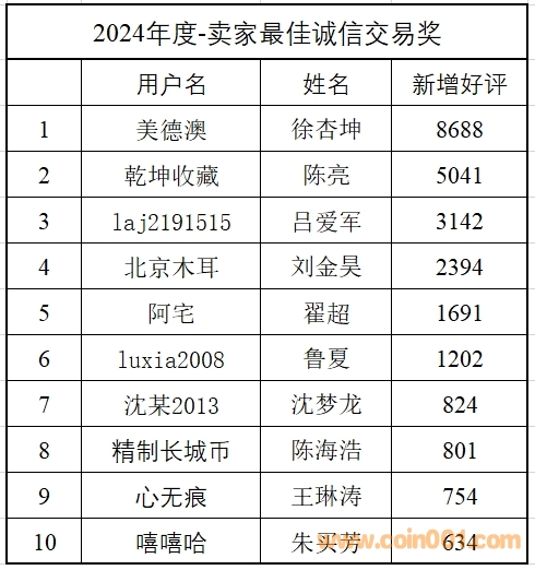 考慮到會員隱私問題,買家獲獎名單不進行對外公布。本年度買家前十名獲得好評的數(shù)量最低為544個,賣家前十名獲得好評數(shù)量最低為634個。 網(wǎng)站版主將與獲獎人員進行聯(lián)系,獎勵的金額將直接轉入獲獎人員的賬戶中。 現(xiàn)代錢幣網(wǎng) 2025.01.06