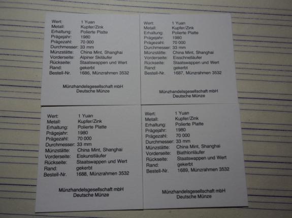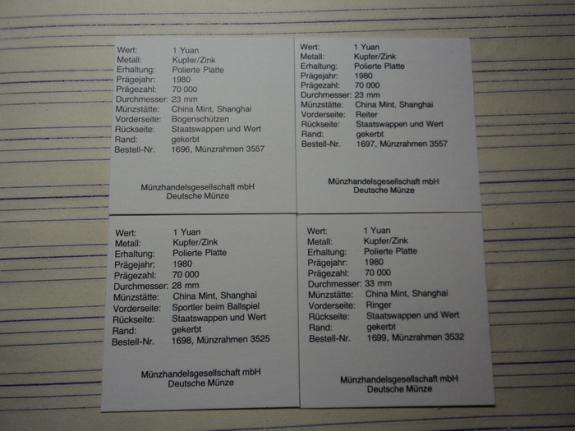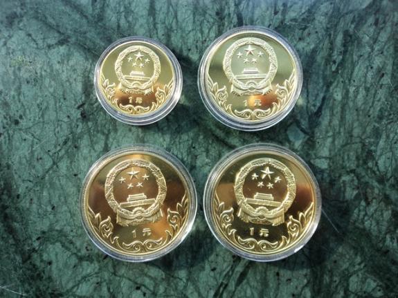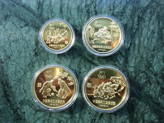 一、中國(guó)奧林匹克委員會(huì)紀(jì)念銅幣。該幣發(fā)行于1980年6月,1套4枚,面值1元,直徑 分別為23、28、32、32毫米,重分別為5.8、8.8、11.9、11.9克,重分別為 11.6、17.6、23.8、23.8克。正面圖案:國(guó)徽、面值1元及裝飾花卉。背面圖案分別為射箭、摔跤、踢球、騎馬、均鑄有“中國(guó)奧林匹克委員會(huì)”、“1980”字樣及奧運(yùn)五環(huán)、國(guó)旗等圖案。