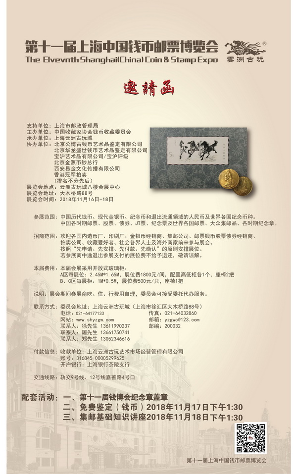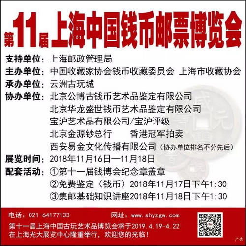 由上海市郵政管理局為支持單位,中國收藏家協(xié)會(huì)錢幣收藏委員會(huì)主辦,北京公博古錢幣藝術(shù)品鑒定有限公司、北京華龍盛世錢幣藝術(shù)品鑒定有限公司、寶滬藝術(shù)品有限公司/寶滬評(píng)級(jí)、北京金源幣鈔總行、西安易金文化傳播有限公司、香港冠軍拍賣協(xié)辦,云洲古玩城承辦的第十一屆上海中國錢幣郵票博覽會(huì)將于11月16日至18日在云洲八樓會(huì)展中心盛大開幕。