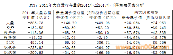在我國金幣市場的這次熊市調(diào)整周期中,貴金屬價格變化對貴金屬幣的貨幣溢價因素也產(chǎn)生了一定影響。從可比性出發(fā),表3分別展示了2011年大盤發(fā)行存量在2011年和2017年的價值結(jié)構(gòu)變化和兩大因素分別產(chǎn)生的作用。