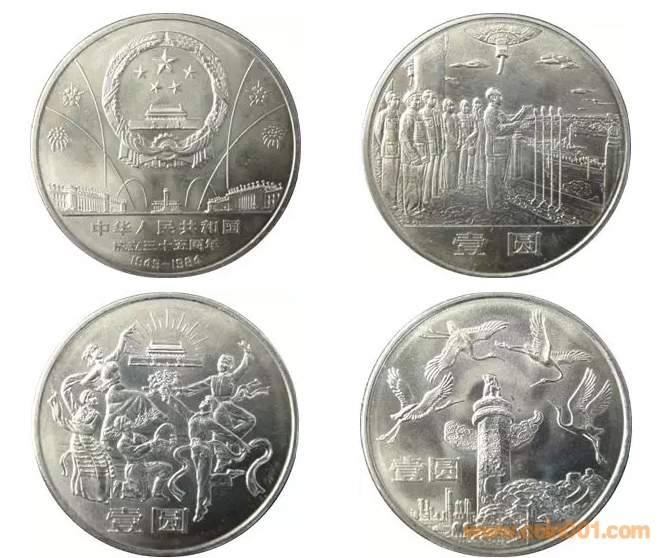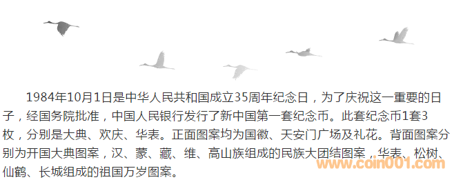 為慶祝中華人民共和國(guó)成立三十五周年,經(jīng)國(guó)務(wù)院請(qǐng)批準(zhǔn),中國(guó)人民銀行特于 1984年10月1日向國(guó)內(nèi)外發(fā)行了第一套具有流通、收藏雙重功能的“中華人民共和國(guó)成立35周年”普通紀(jì)念幣,全套3枚。由沈陽(yáng)、上海兩家造幣廠鑄造。其中上海造幣廠生產(chǎn)的精制幣不知什么原因沒(méi)有正式發(fā)行,直到2007年5月才有約50套流出被收藏愛(ài)好者發(fā)現(xiàn)并作珍品收藏。