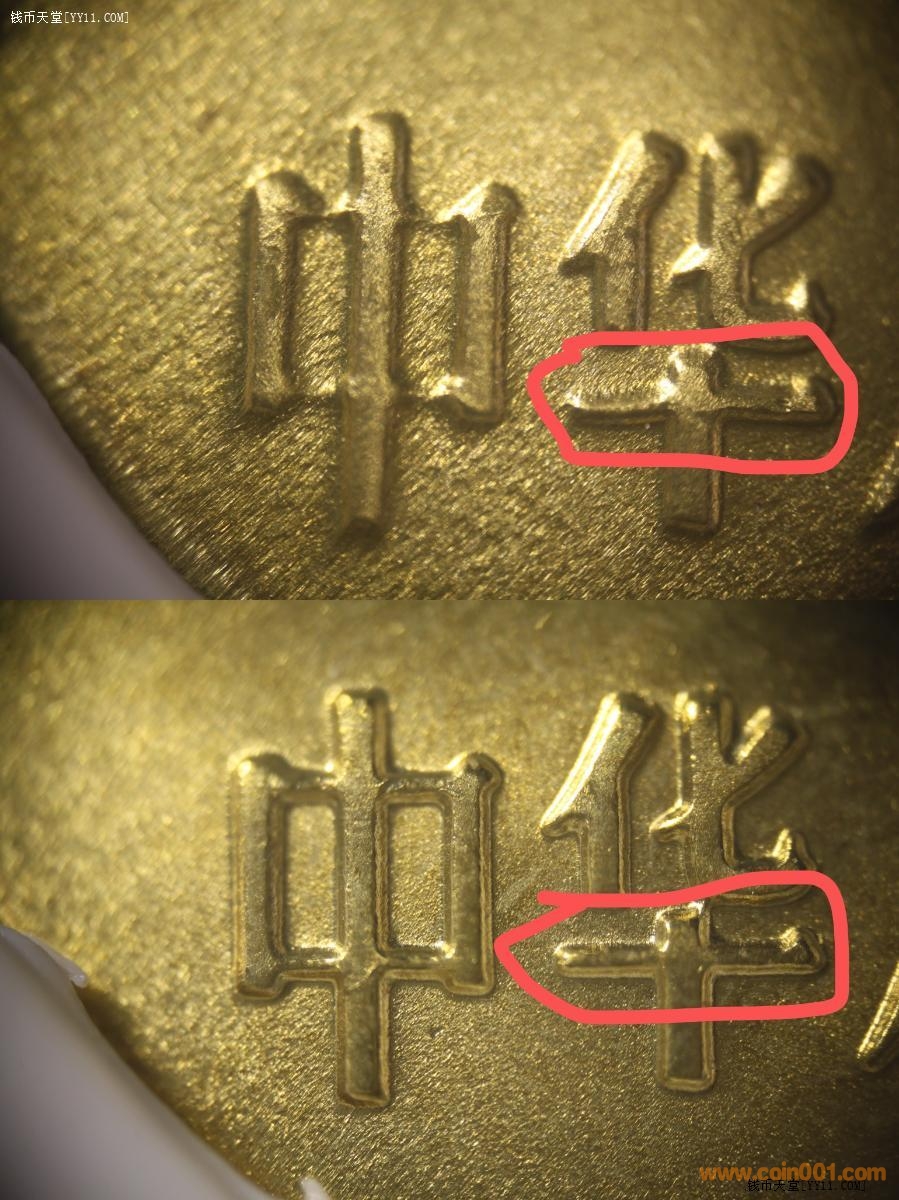 94梅花“川”形“中”不是啥“隱起文”,實質就是筆畫較細,模具容易磨損和堵塞導致凸起圖文變淺甚至消失,最近發(fā)現的鱷魚幣“缺橫”版一樣,與泰山紀念幣的“無梯版”也一樣,都屬于凸起圖文的弱打現象,“華”字最后一橫不平直,也是屬于修模導致的,也不是“隱起文”,原模設計肯定不是“中字缺兩橫筆”,不是“華字橫筆不平直”,只是這一對工作模壓印過程中出現問題的錯鑄現象。
