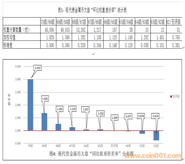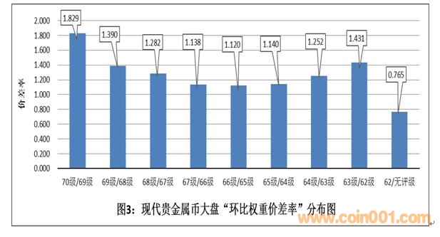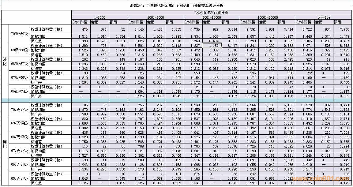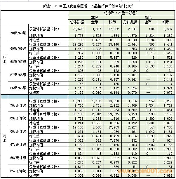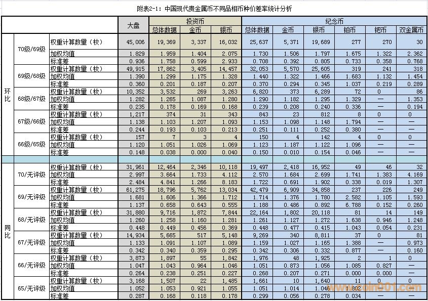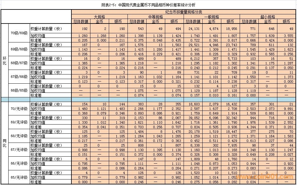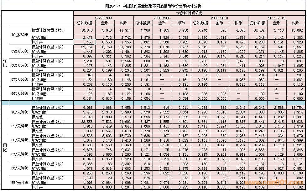 (1)同比價差率:以“無評級幣”為“計算基點”,在可對應條件下,分別計算各級別幣種與“計算基點”的價差率。例如:70級/無評級、69級/無評級幣……等等。