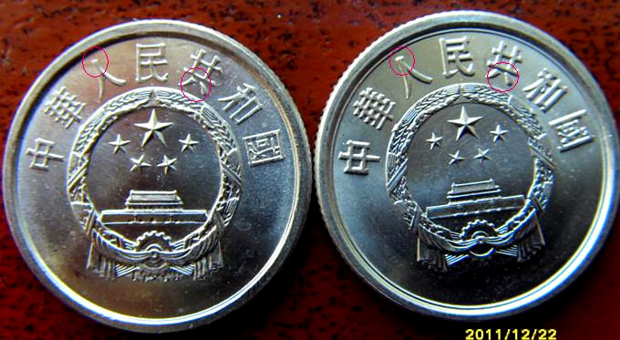 ???????? 除上述主要的典型區(qū)別之外,“平版”與“凸版”還有諸如“民”字的提勾、“共”字的撇、“中”、“華”筆劃底部等寫(xiě)法也有細(xì)微的區(qū)別,在此不再一一贅述。據(jù)筆者收集和研究,少見(jiàn)年份一個(gè)年版號(hào)同時(shí)鑄造有平版和凸版兩種版別分幣,1分為79、80、81、82、84年號(hào);2分為81、82、83、84年號(hào);5分為81、83、84年號(hào)。