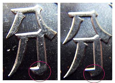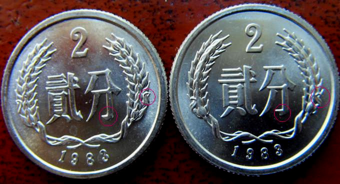 ???????? 第二種版別稱之為“凸版”(露芒拐角勾人字頭頓筆,見(jiàn)圖1、2、3、4、5對(duì)比圖):主要是由上海造幣廠鑄造的,是硬分幣第二種常見(jiàn)的版別。凸版硬分幣共有27種(1分 16種,2分 4 種,5分7種),其主要特征是:1、分幣背面左右麥穗從下面數(shù)第二個(gè)麥芒尖部與飄帶的結(jié)合部特征是麥芒尖部穿過(guò)飄帶而“凸”出在飄帶之上;2、分字的刀字部的勾是“凸”起的拐角勾;3、分字刀里的撇和刀的橫是部分分離的或者分開(kāi)較平版明顯,撇的奈筆“凸”出而游離;4、正面人字的人字頭有頓筆,也是“凸”出的;總之,這種第二種常見(jiàn)的版別的特征就是“凸”,因此可以用“凸版”概括其特征。