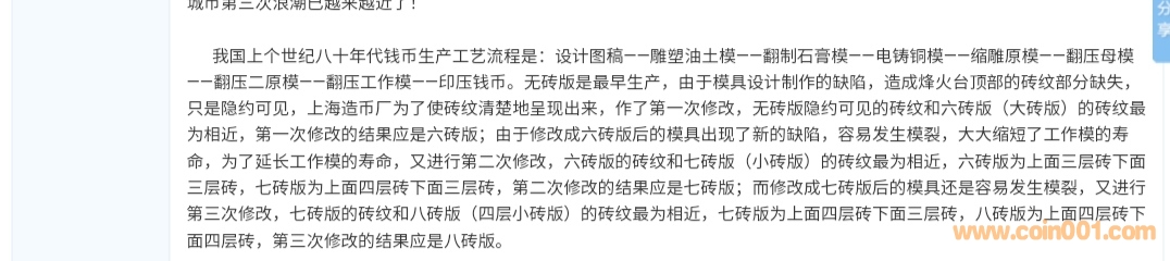 普制80長城幣模具的這種三次修改只能在油土模或石膏模上進(jìn)行,從而無磚版、六磚版(大磚版)、七磚版(小磚版)、八磚版(四層小磚版)都有各自獨(dú)立的原模,(對于造幣廠而言,原模就是造幣廠的官方版別,而二原模以及工作模等等的差異引起的版別,造幣廠官方是不認(rèn)可的,只能算是民間的小版別),所以普制80長城幣的無磚版、六磚版、七磚版、八磚版都是造幣廠官方認(rèn)可的大版別,且這四大版別都是平行平級關(guān)系。