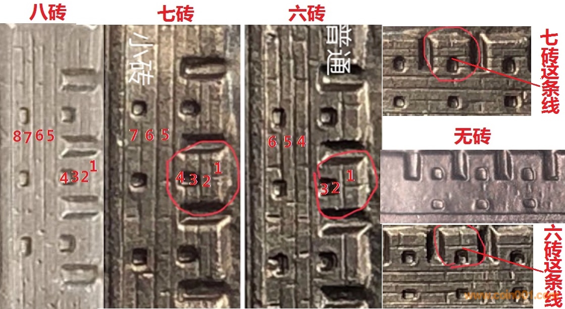 我國上個世紀(jì)八十年代錢幣生產(chǎn)工藝流程是:設(shè)計圖稿——雕塑油土?!剖嗄!婅T銅?!s雕原?!瓑耗改!瓑憾!瓑汗ぷ髂!哄X幣。無磚版是最早生產(chǎn),由于模具設(shè)計制作的缺陷,造成烽火臺頂部的磚紋部分缺失,只是隱約可見,上海造幣廠為了使磚紋清楚地呈現(xiàn)出來,作了第一次修改,無磚版隱約可見的磚紋和六磚版(大磚版)的磚紋最為相近,第一次修改的結(jié)果應(yīng)是六磚版;由于修改成六磚版后的模具出現(xiàn)了新的缺陷,容易發(fā)生模裂,大大縮短了工作模的壽命,為了延長工作模的壽命,又進(jìn)行第二次修改,六磚版的磚紋和七磚版(小磚版)的磚紋最為相近,六磚版為上面三層磚下面三層磚,七磚版為上面四層磚下面三層磚,第二次修改的結(jié)果應(yīng)是七磚版;而修改成七磚版后的模具還是容易發(fā)生模裂,又進(jìn)行第三次修改,七磚版的磚紋和八磚版(四層小磚版)的磚紋最為相近,七磚版為上面四層磚下面三層磚,八磚版為上面四層磚下面四層磚,第三次修改的結(jié)果應(yīng)是八磚版。