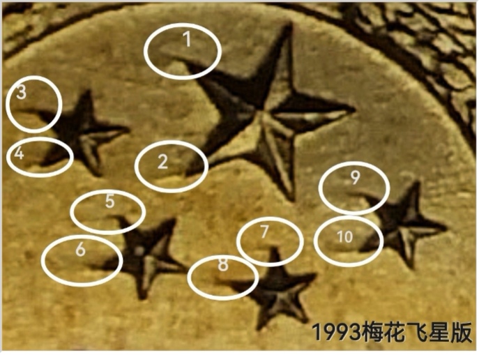 “飛星版”梅花幣主要在1993年年號(hào)里,出現(xiàn)在被梅花幣愛(ài)好者稱(chēng)之為“93粗版”之中,數(shù)量不多。