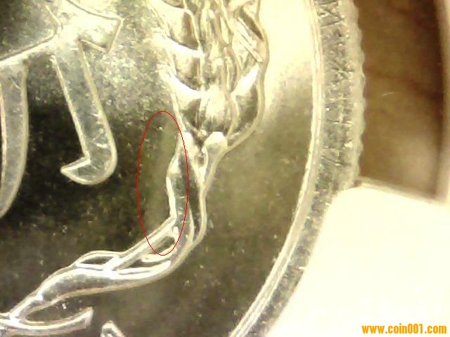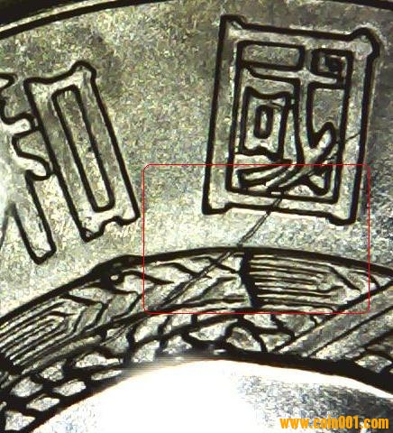 樓主所貼的圖1,是一個模裂線的特征,是當(dāng)年的工作模上面有一條凹裂痕,導(dǎo)致該工作模打制出來的所有硬幣,幣面上都凸起一條同樣的凸線。如果按樓主所說,有4枚高分612在國徽面具有這種相同的凸線,那么它們肯定就是同一個工作模打制出來的同胞兄弟,即使不是同一卷里的,也是同一生產(chǎn)批次里的。