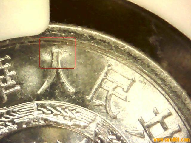 1)人的邊緣位置處有可見鑄造缺陷,肉眼看感覺像是淺表面氧化,放大后發(fā)現(xiàn)為鑄造缺陷有明顯的凹陷,由于此缺陷在邊緣位置對于幣的整體狀態(tài)感覺影響不大(見圖2,4)                                              2)分幣的國徽面有鑄造缺陷(見圖1紅色標(biāo)記)缺陷位置集中在國徽一側(cè),目前發(fā)現(xiàn)有4枚硬幣存在此缺陷,由于位置不同給人的感覺也不同,整體影響有限。