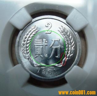 分字的下側(cè)有非常明顯的鑄造細(xì)紋,肉眼觀察不易察覺,用10倍放大鏡看非常清晰,目前出分的每枚高品質(zhì)61年2分都存在這個特點,我認(rèn)為是判斷此幣最有效的方法(見圖3,5紅色標(biāo)記)
