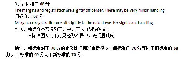 但新標(biāo)準(zhǔn)實(shí)施時(shí),應(yīng)當(dāng)采取換款識(shí)、色標(biāo)、啟用日期等方式,與舊標(biāo)評(píng)定進(jìn)行明顯區(qū)分,不然造成舊標(biāo)主定的價(jià)值大幅流失,造成一種非正常的管殺不管埋的降值,有損于評(píng)級(jí)公正公平的承繼性。
